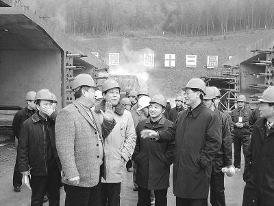 日前,铁道部副部长卢春房到十三局集团甬台温铁路项目部梁场检查工作。十三局集团总经理雷升祥(前排右三)陪同检查。卢春房一行听取了箱梁生产情况汇报,对箱梁质量给予了高度评价。图为卢春房(前排右二)与大家亲切交谈。 李仕兵 王玉林 摄