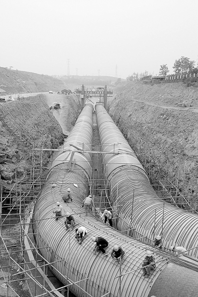 十六局集团承建奥运配套工程南水北调PCCP段四标工程的建设者们,正倒排工期,加紧进行管道安装。据悉,管道安装主体工程将于4月完工。 本报记者 成海忠 摄