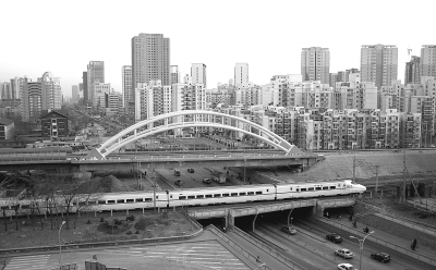 由十八局集团等参建单位施工的北京奥运会交通配套工程——京津城际客运专线,力争五月前完工。图为一列动车组从京津城际跨新开路钢管拱立交桥旁穿过。伍 振 摄