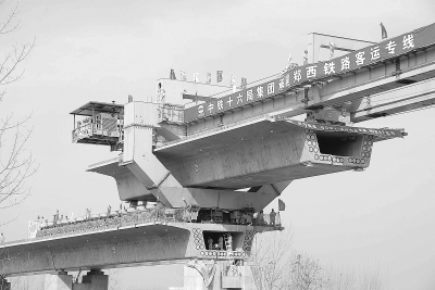 二○○八年是郑西客运专线的决胜年,面对繁重的施工任务,十六局集团郑西客专指挥部超前谋略,主动出击,广泛开展了百日大干活动。图为九百吨箱梁在架设中。 刘亚林 摄