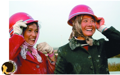 十八局集团女职工积极参与重点工程建设。图为京津城际全线铺通时,她们脸上乐开了花。伍 振 摄