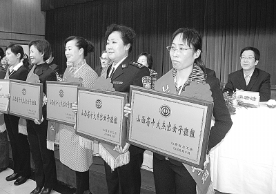 3月3日,十七局集团一公司广深港项目试验室女子工班被山西省总工会授予“山西省十大女杰班组”。该试验室17名职工中有女职工12人,在业主组织的试验室工作评比中,曾连续3次获得一等奖。图为试验室负责人苗荣春(右一)代表班组上台领奖。 江 浩 韩小英 摄