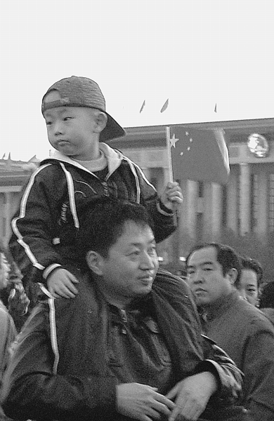 左下图:两会期间,春意盎然,首都一派节日的气氛。众多群众特意来到天安门广场,庆祝盛会的召开。图为观看完人大代表入场的一对父子。 刘亚鹏 摄