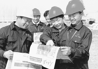 右下图:两会召开之际,十七局集团职工们同全国人民一样特别兴奋和关注。图为该集团一线职工在工余时间阅读两会消息。 杨春杰 摄