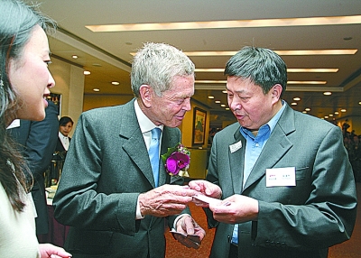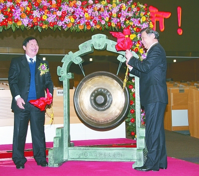 ▲董事长李国瑞、总裁金普庆敲响了中国铁建上市的铜锣 |
