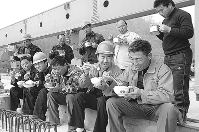 十二局集团四公司合武梁场项目部,共产党员、共青团员争当技术标兵和岗位能手,经过半年的实际操作,模板制作、钢筋布网、梁片生产等全部实现了一条龙生产作业。图为职工与项目部书记张新民(前右二)一起乘制梁间隙吃午饭。 安剑承 摄