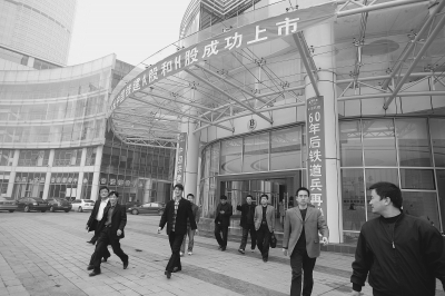 3月份以来,中国铁建股份有限公司A股和H股成功上市后,遍布全国各地的广大职工,纷纷在工地、办公区挂横幅、写楹联,用多种形式表示庆贺。图为中国铁建职工从重庆北部新区高科技园水大厦兴高采烈走出的情景。本报记者 刘民主 摄