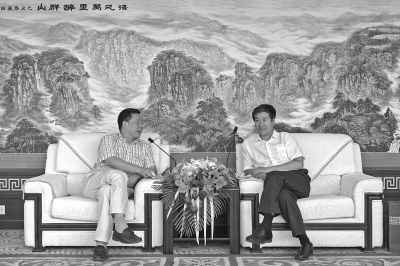 图为范德与刘烈东亲切会谈。 本报记者 刘建国 摄