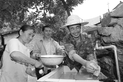 近日,十二局集团三公司十天高速公路A-CD43标项目部,把一股清澈的山泉从几公里外的山上引入驻地陕西省旬阳县庙沟村,从而结束了村民们祖祖辈辈到汉江边一条小河里挑水吃的历史。村民们到处奔走相告:用上自来水是我们过去想都不敢想的事情,是十二局集团给我们带来了福气啊。瞧,村民们足不出户用上自来水,笑得多开心! 冯学亮 摄
