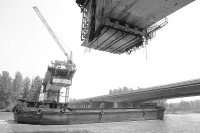 7月21日,记者在由十二局集团承建的京沪高速铁路四标段二项目部京杭运河特大桥(5400米)主航道大跨度(100米)挂篮施工中看到,由于安全防护严密细致,确保了繁忙的京杭运河大小船只的安全畅通。