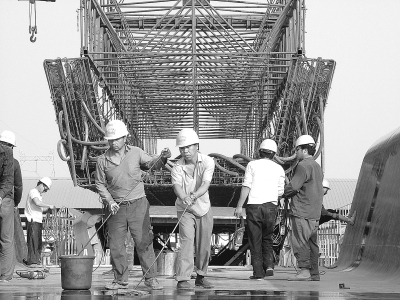 7月21日,京沪高速铁路北冯制梁厂建设工地,十二局集团三公司的建设者们冒着高温奋战在生产一线,为保工期不误架梁加班加点,全力加快施工进度。 刘 洪 摄
