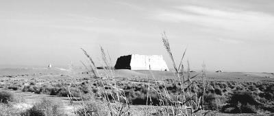 距“小方盘城”20公里处,有一座“大方盘城”,它处在戈壁环抱的一个凹地中,古堡在阳光的斜照下,金光灿灿,再衬上那后面一平如镜的透蓝的湖水,显得极为醒目。