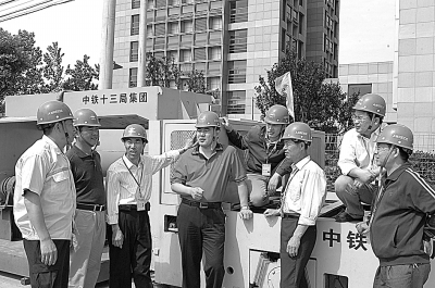 十三局集团二公司苏州地铁项目部把学习实践科学发展观活动的课堂搬到施工一线,在重点工程设立“党员先锋岗”、“党员责任区”,开展形式多样的技术比武和劳动竞赛,促进学习实践活动向纵深发展。图为二公司副总经理兼苏州地铁项目部经理穆永江(左四)与项目部班子成员一同研究攻坚方案。李仕兵 摄 |