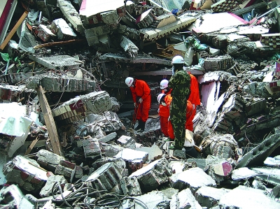 走到十三局集团三公司都汶高速公路项目部租住的镇政府办公楼前,连一根撑起的柱子都没有,整座办公楼完全俯伏在地。就在这堆瓦砾下,还掩埋着8名遇难者的遗体,等待部队统一搜寻安葬。