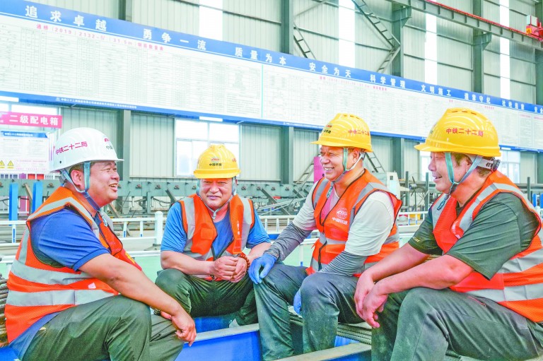 近日,中铁二十二局津潍高铁项目部党支部深入班组,开展主题党日活动,派驻党员与班组成员开展谈心谈话,为他们讲解施工安全防范要点和应急知识,并共同观看了安全教育警示小视频,让一线工人真正感受到党组织关怀。随后,派驻党员前往钢筋加工厂、线下桩基灌注现场,排查安全隐患,提醒现场作业人员注意用火、用气、用电安全,切实增强班组安全防范意识。图为派驻党员(左一)在工间休息时与班组成员谈心。